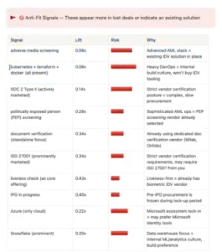 Two examples from the episode. SOC 2 Type 2 compliance on the target’s website was a positive for B2B buyers. Intuitive. The counterintuitive one was advanced engineering culture with heavy in-house tooling. Engineering-dense companies often look like good prospects on paper because they have the technical maturity to evaluate the product. The model surfaced the pattern that they close less frequently because they tend to build rather than buy.
