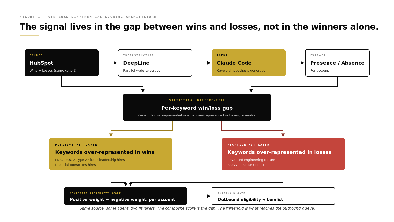 This is not a data gap. It is a sourcing gap. The data sits on every target’s public surface. What is missing is a method for finding which specific patterns on that surface correlate with wins, and the compute to test that against every account at a cost that makes the work economical.