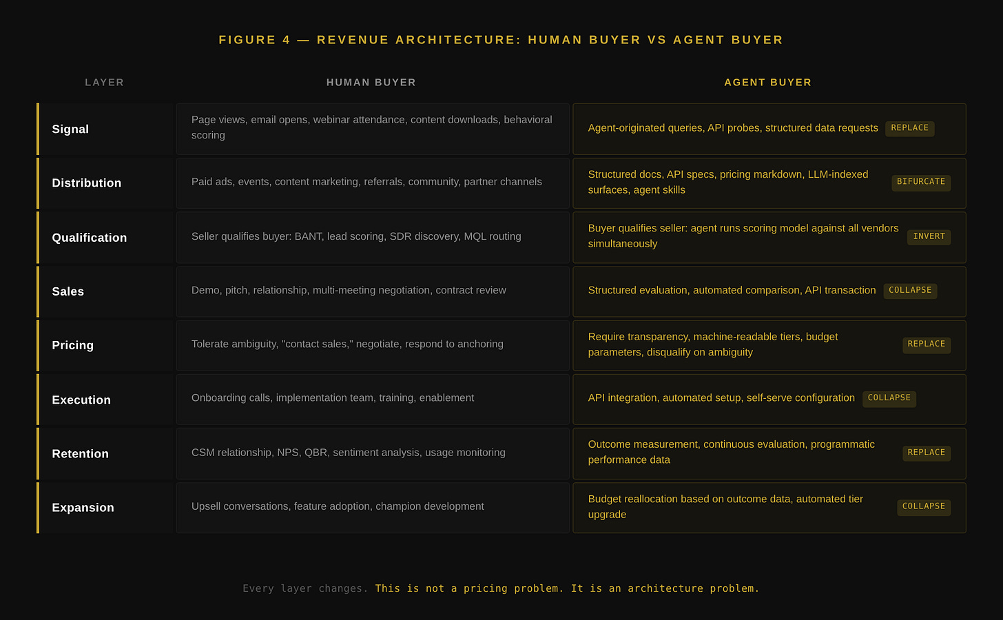 That conversation is necessary. It is also incomplete. Pricing is one layer. When the buyer is a machine, the disruption runs through every layer of the revenue architecture, from signal detection through execution. The companies preparing for this by optimizing their pricing page are solving the surface problem. The structural problem is that their entire go-to-market system was designed for a buyer that reads emails, attends demos, and makes emotional decisions. That buyer is being replaced.
