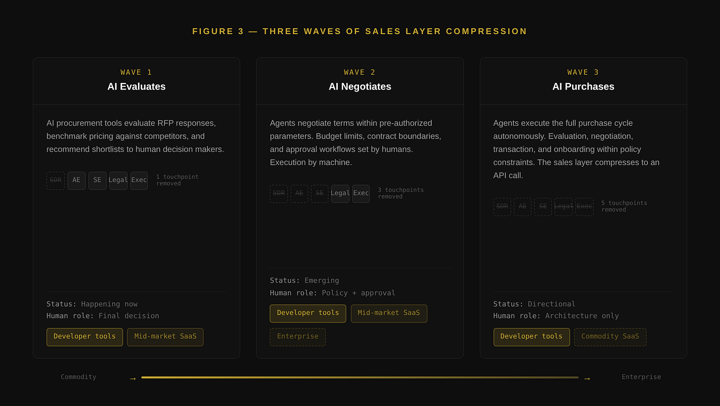 For enterprise products, the compression is slower but directional. The first wave is AI procurement tools that evaluate RFP responses, benchmark pricing, and recommend shortlists. The second wave is agents that negotiate terms within pre-authorized parameters. The third wave is agents that execute the full purchase cycle autonomously within policy constraints set by a human buyer.