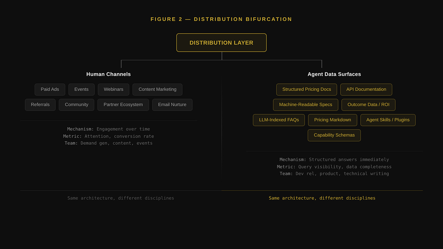 The distribution layer does not disappear. It bifurcates. Human buyers still need channels. Agent buyers need data surfaces. Most companies will need to architect for both simultaneously, and the organizational challenge is that the teams, tools, and metrics for each are completely different. The marketer who runs your webinar program is not the same person who structures your pricing documentation for LLM ingestion. These are different disciplines operating on different layers of the same architecture.