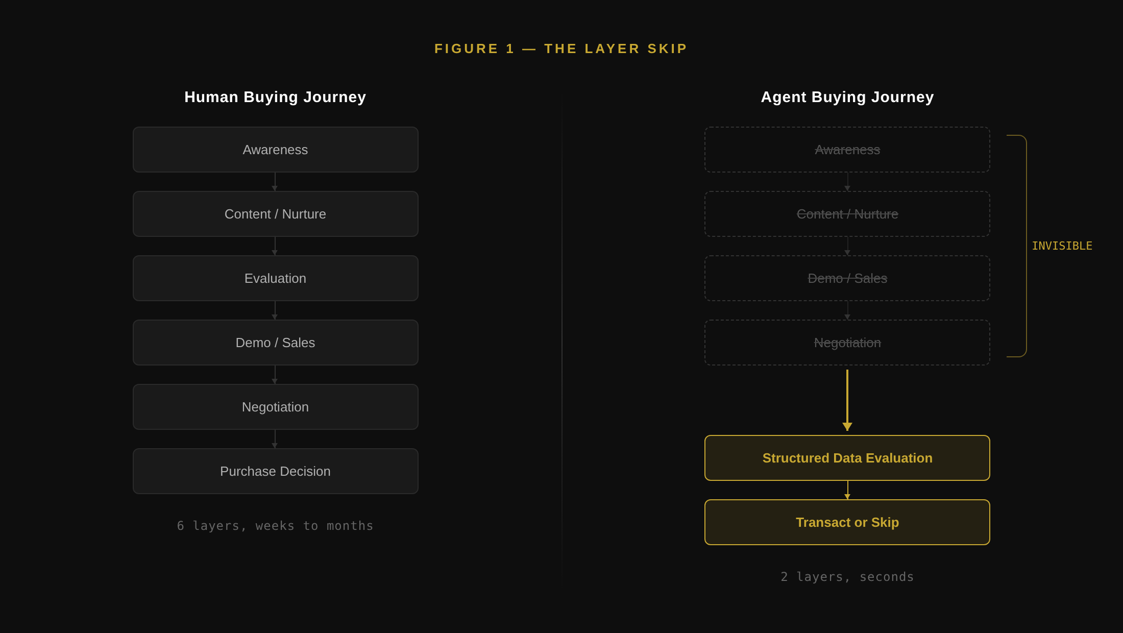 At the Execution layer, the motion compresses. For some segments, the entire sales cycle collapses into a single API transaction. For others, the human sales process persists but with an agent handling evaluation and shortlisting upstream.