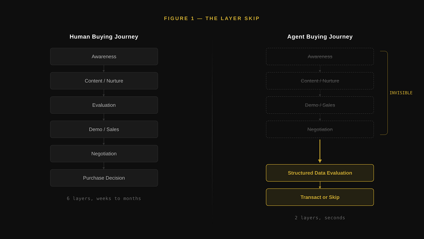 This is not a content marketing problem. It is a layer collapse. The entire top-of-funnel infrastructure that most B2B companies spend 30 to 50 percent of their marketing budget on becomes invisible to agent buyers. Not inefficient. Invisible. The agent never enters the layer.